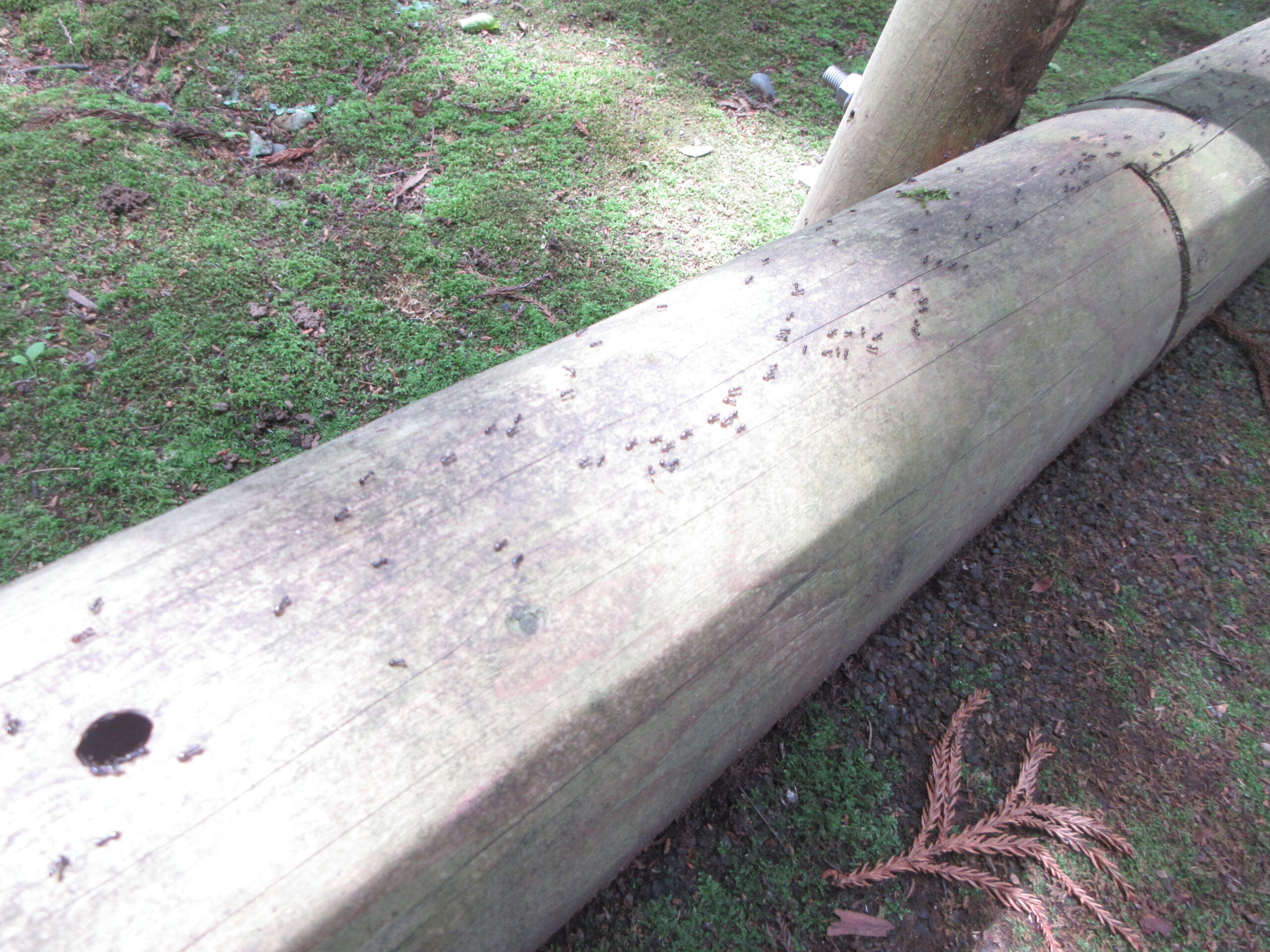次に森の中を散策します、木の柵の上にありの行列を発見🐜
