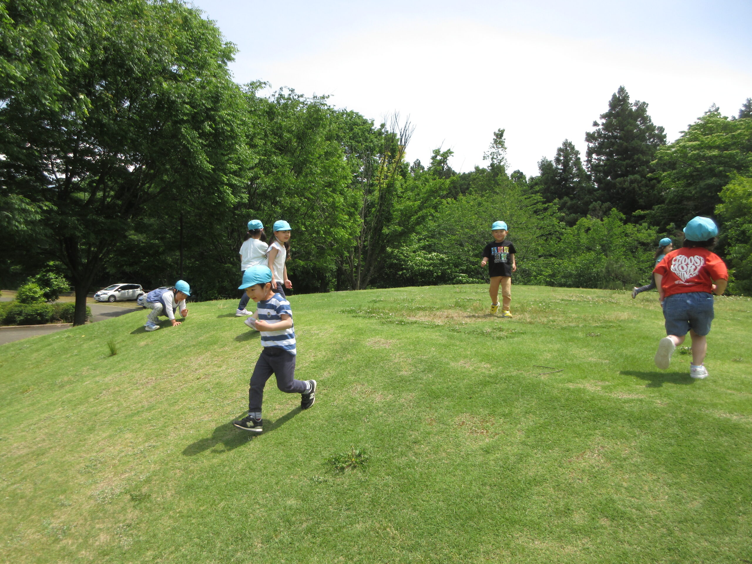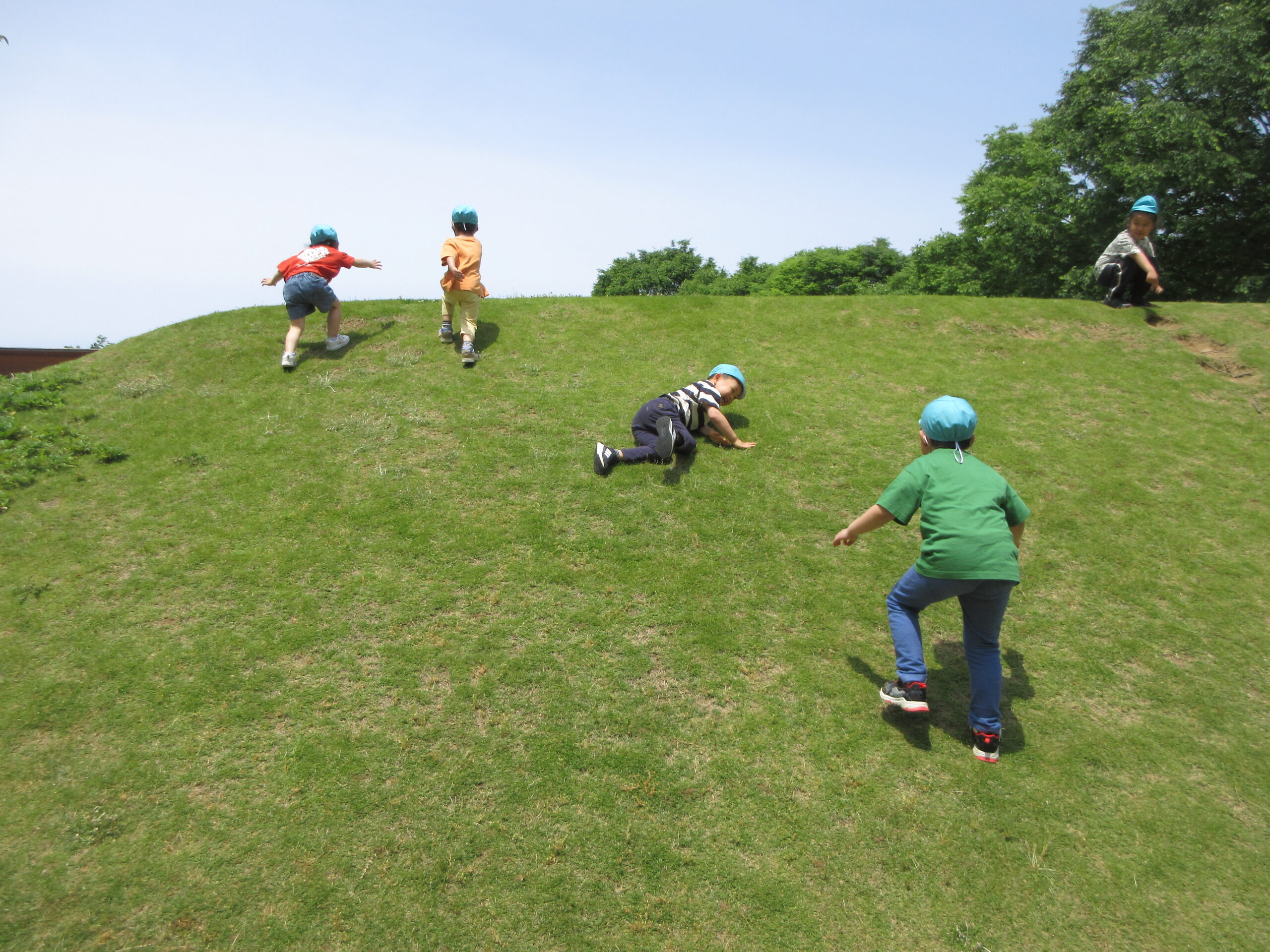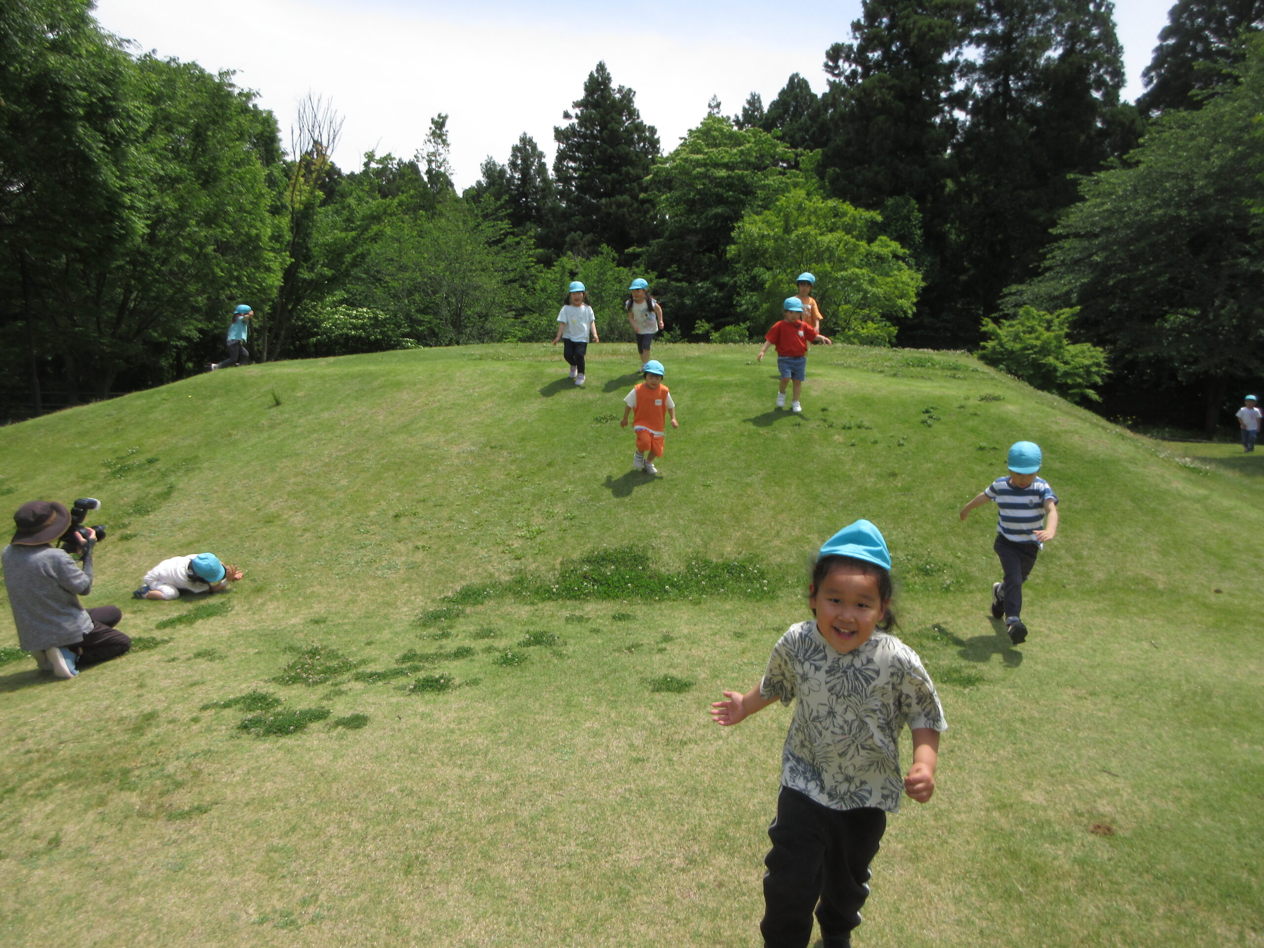 小高い芝生の山を昇り降りしたり、転がってみたりと汗だくで遊びました💦