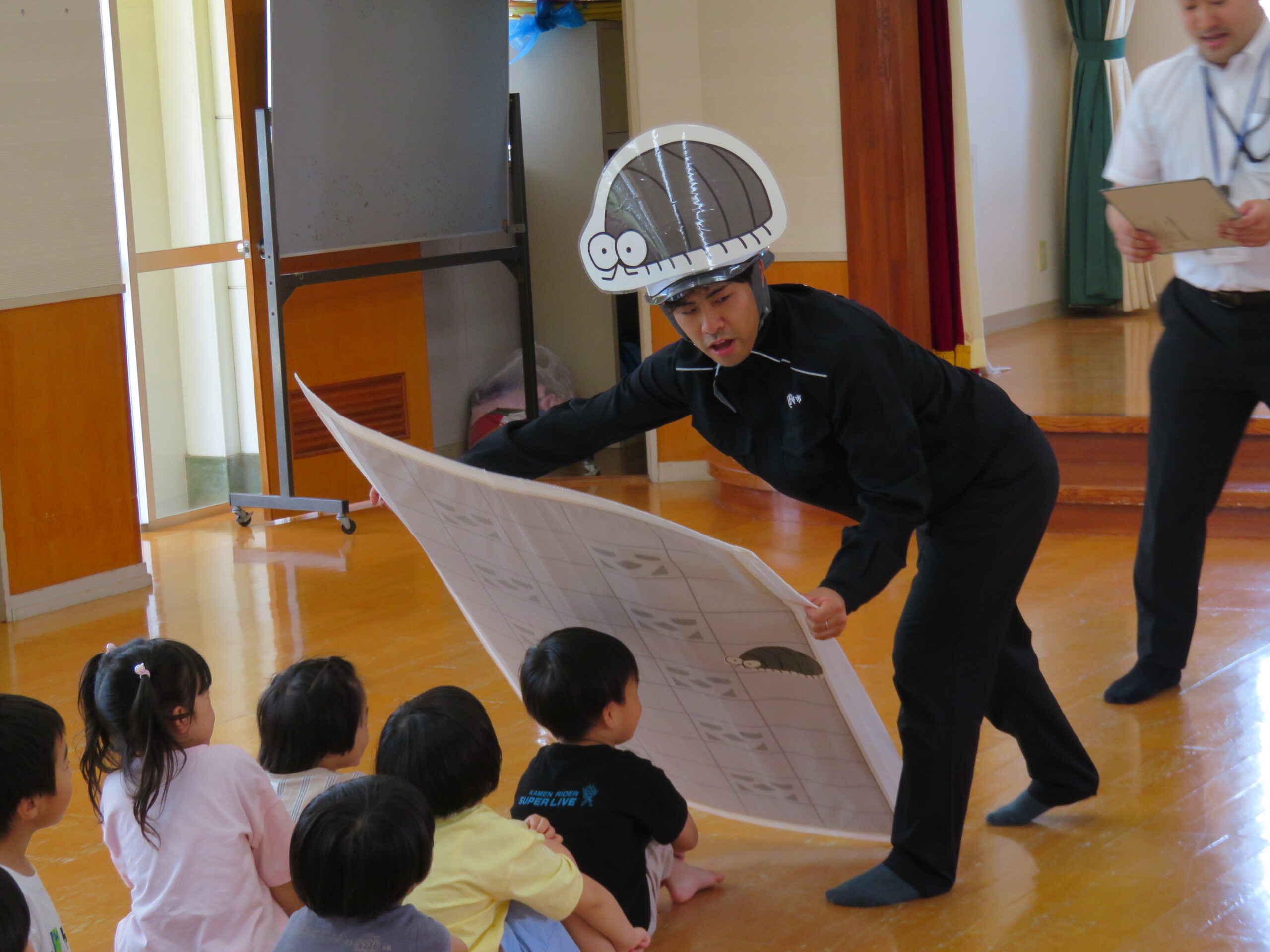 「ダンゴムシせんせい~」の子どもたちの掛け声で、ダンゴムシ先生が登場❗