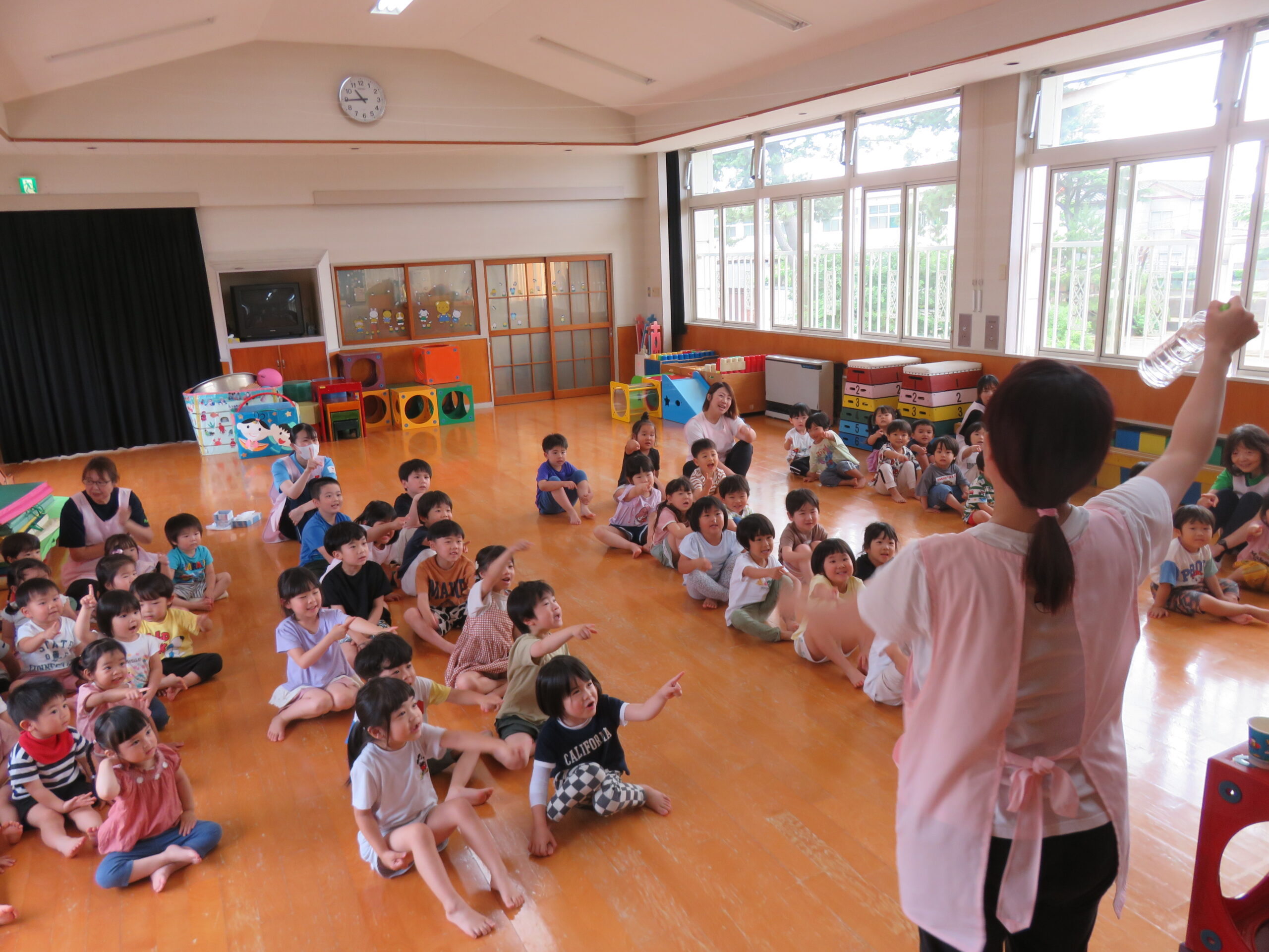 子どもたちの「ちちんぷいぷいのぷい!」の合図でペットボトルを振ると、中に入ってる
