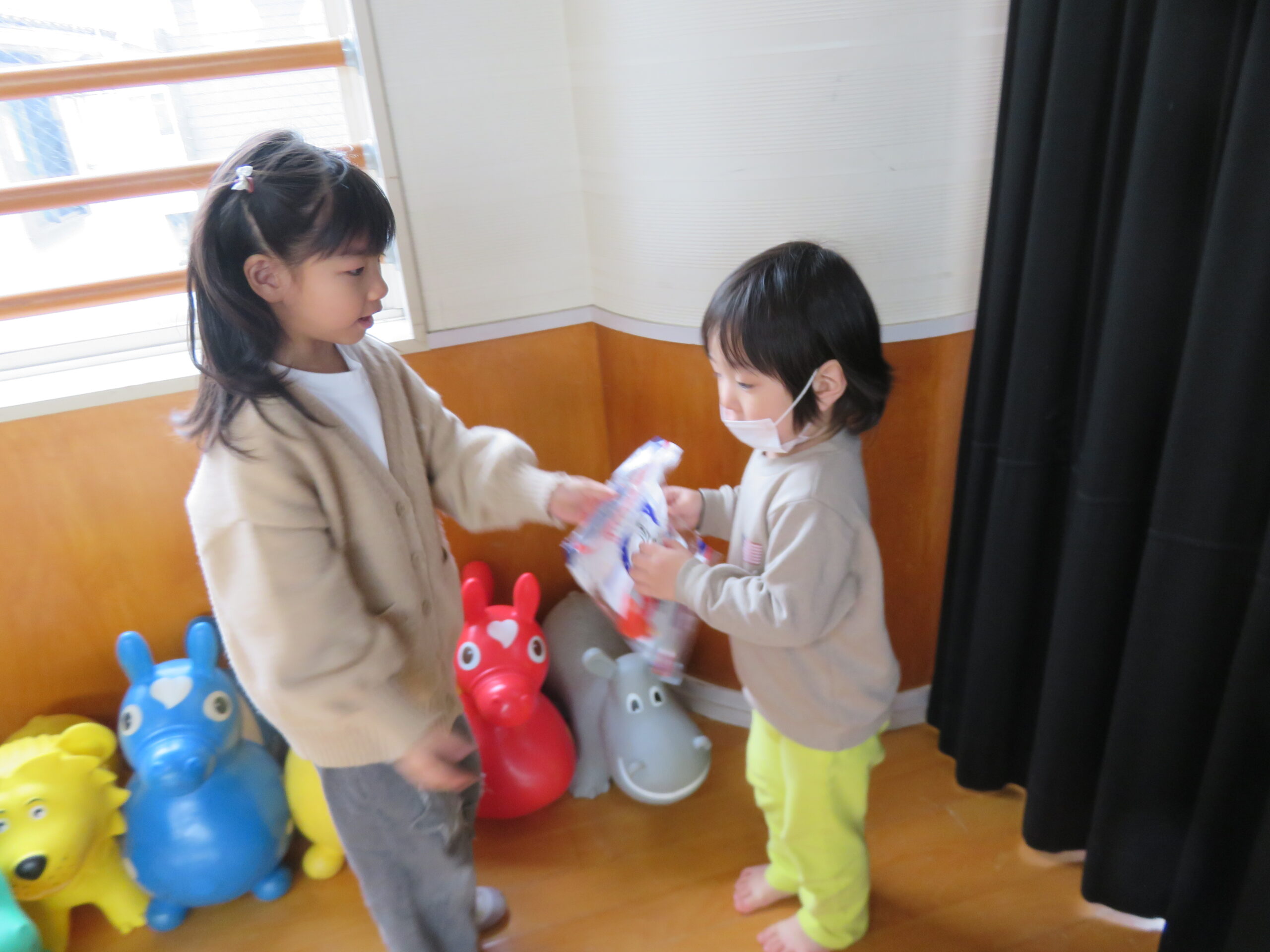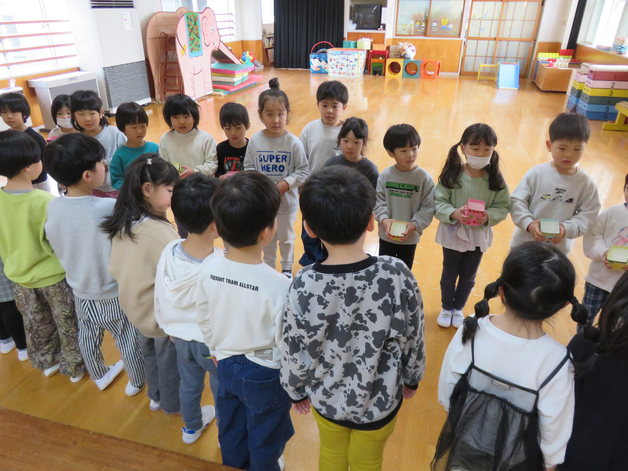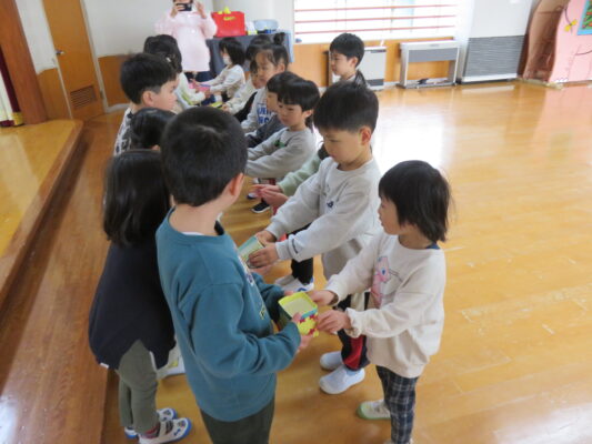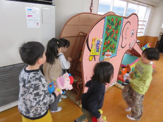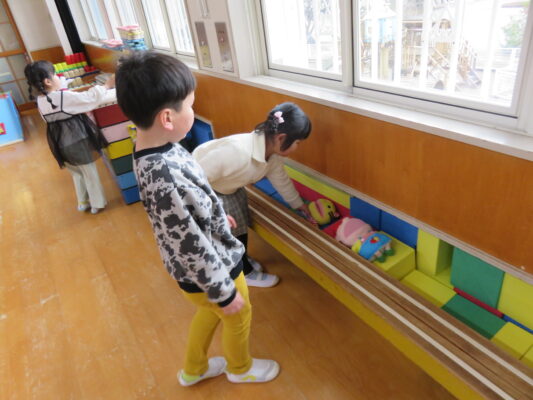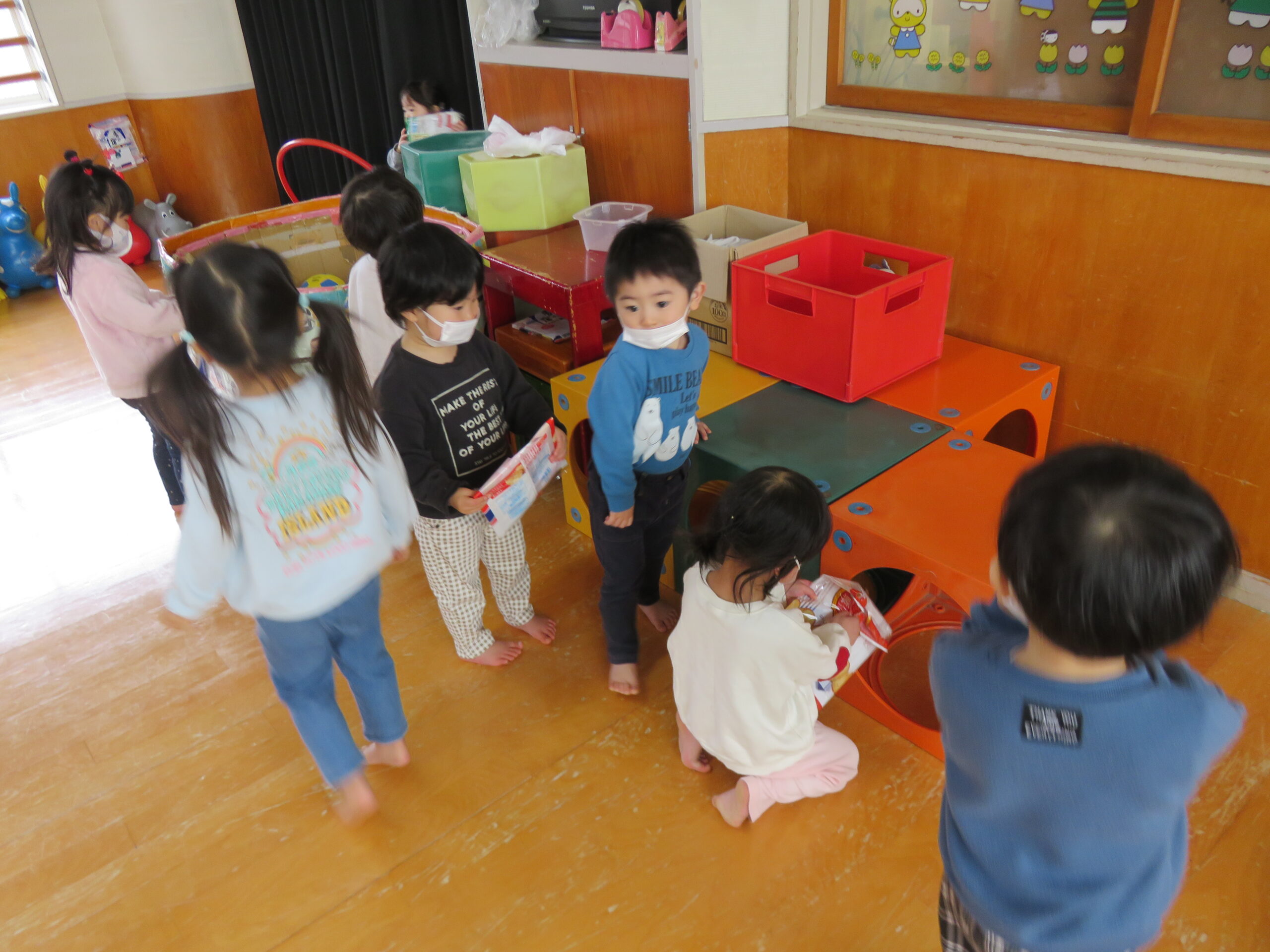当日は遊戯室に各クラスを招待して、たからさがしをしました😊