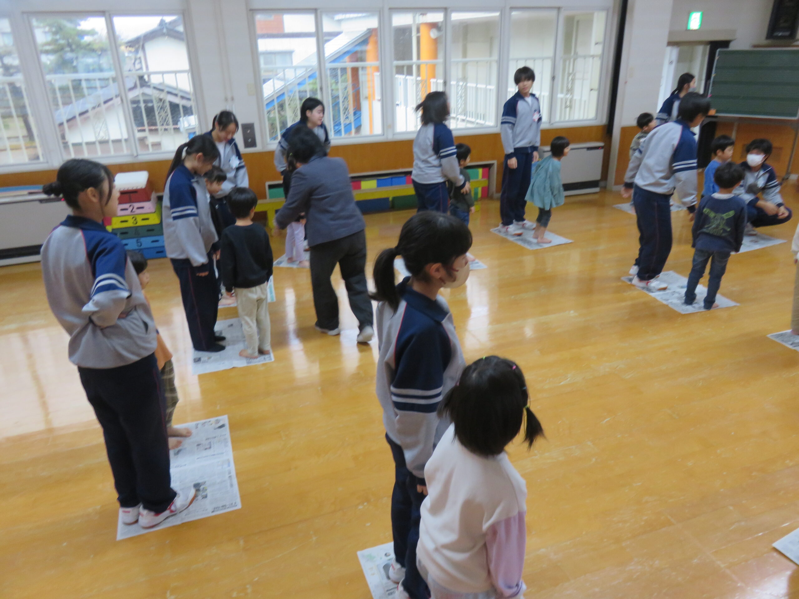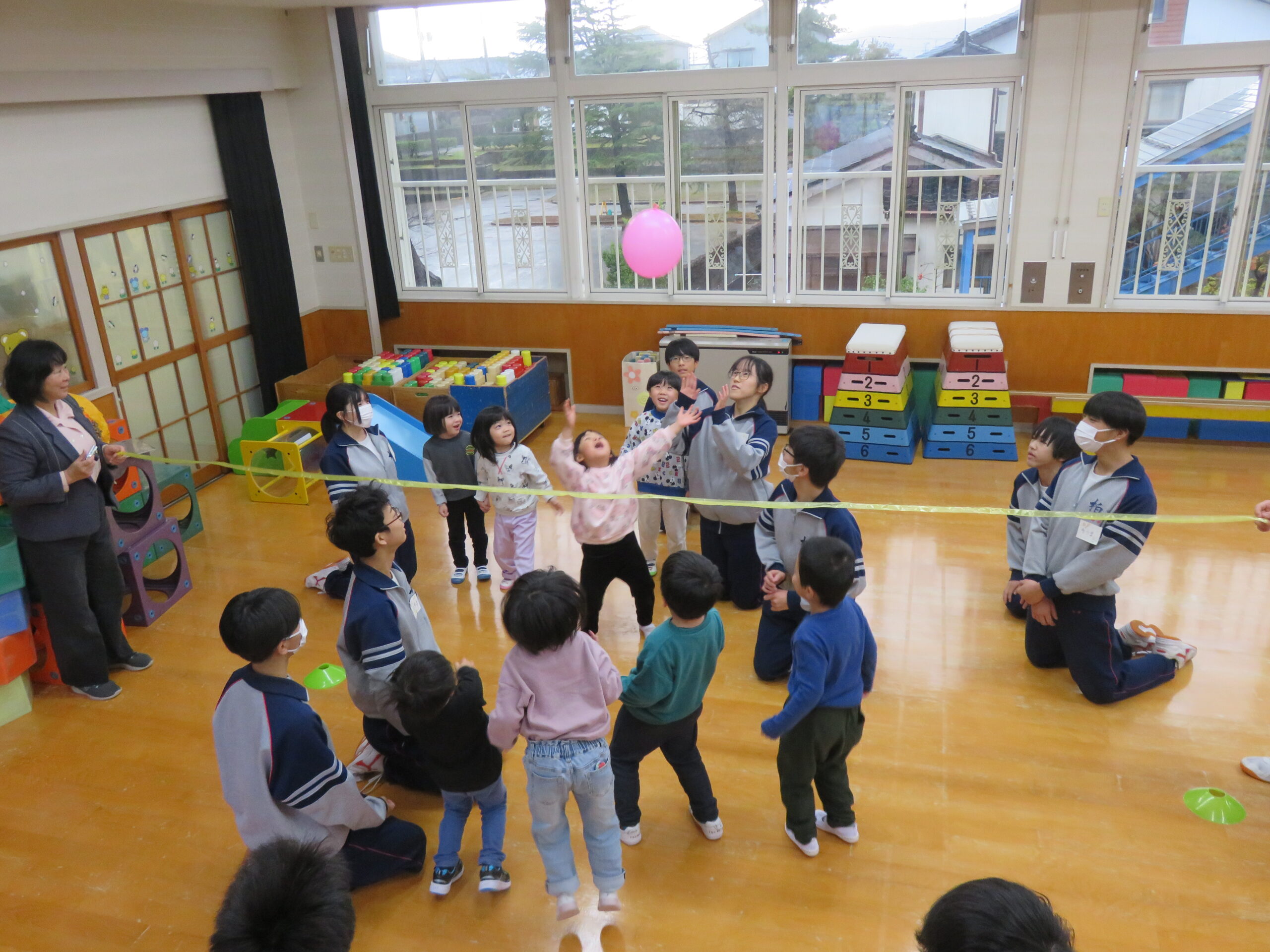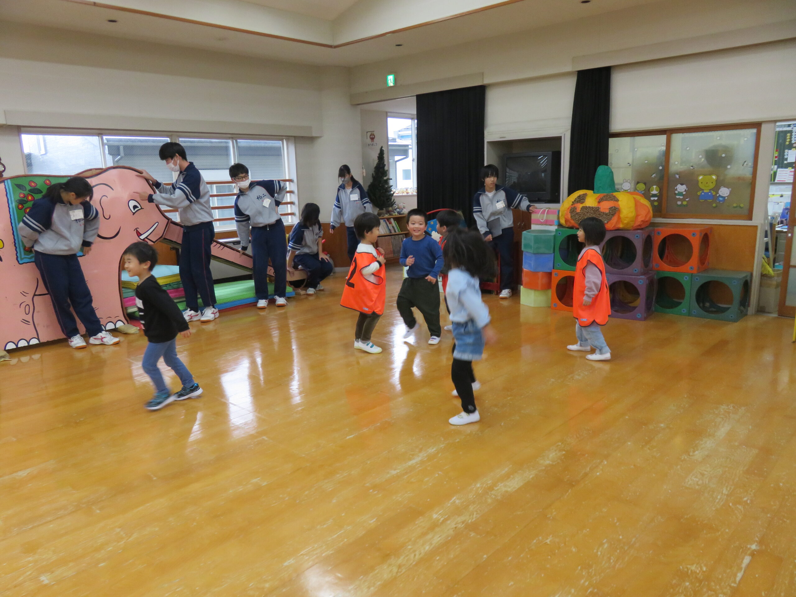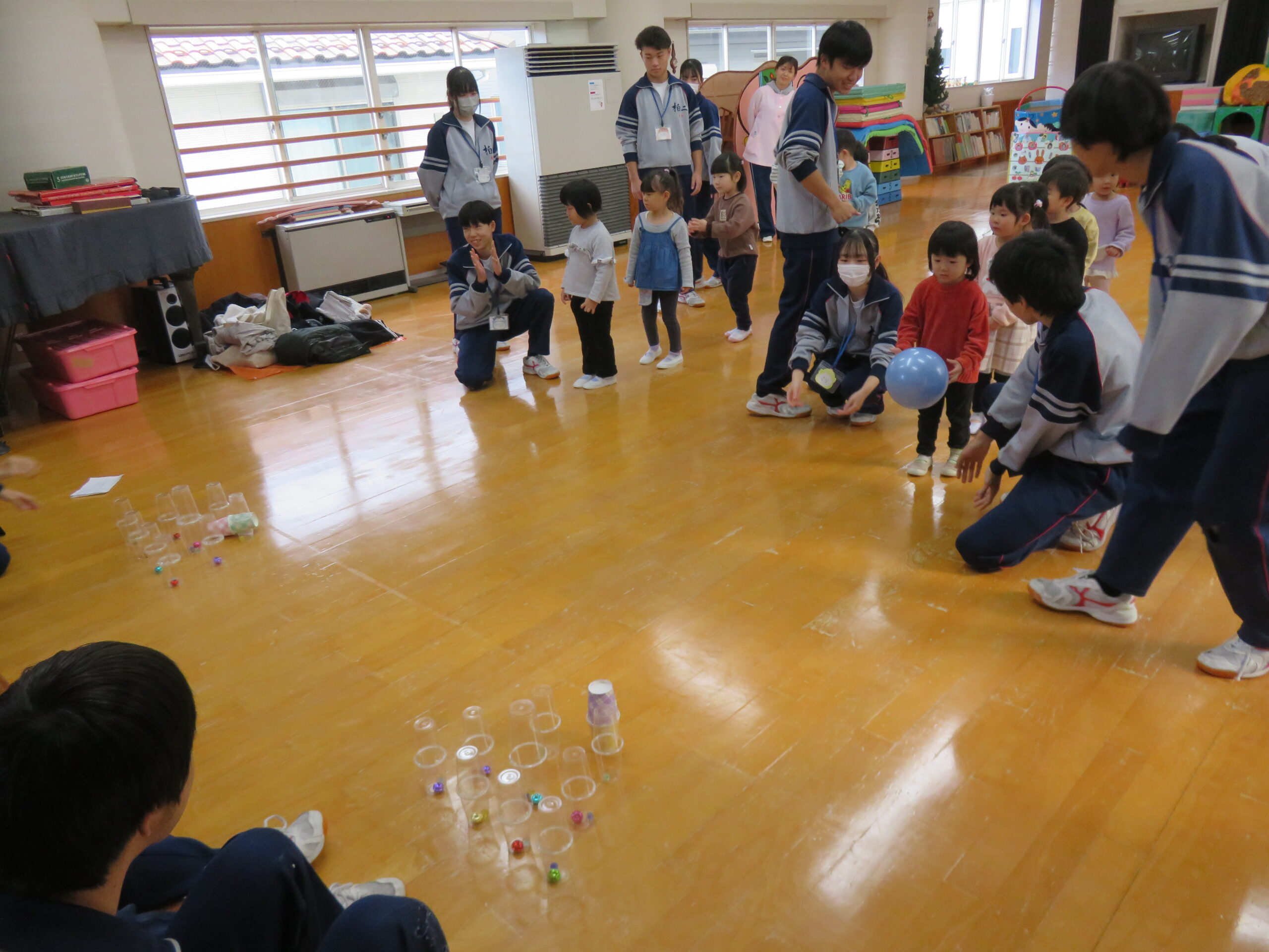 お兄さん、お姉さんたちが考えてきた遊びを一緒に行いました。優しい言葉がけや子どもたちを気づかって手助けしてくれたり等、子どもたちも安心して楽しく参加することができました。