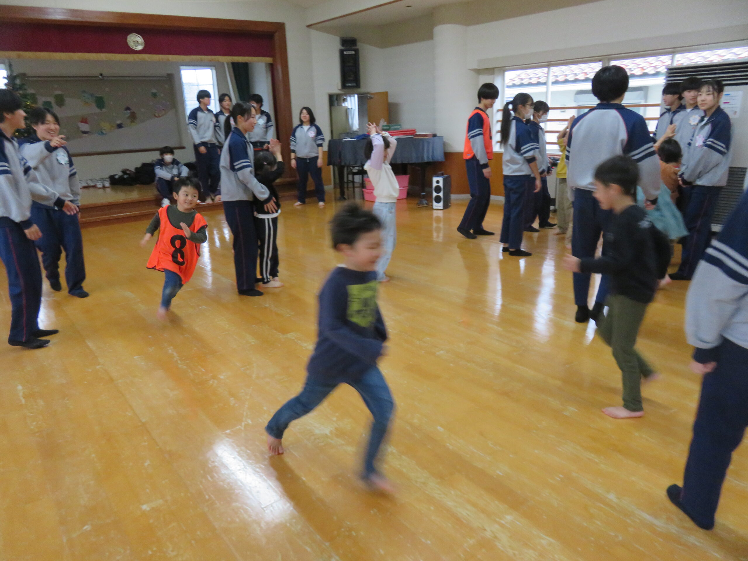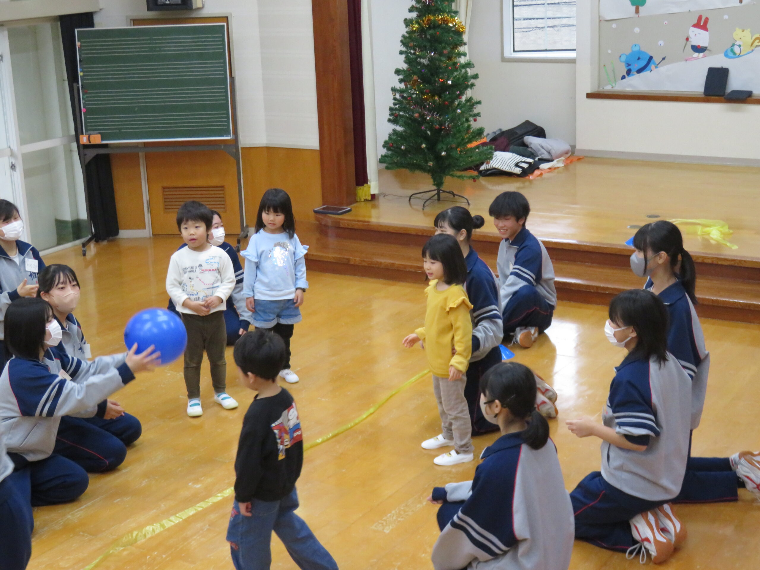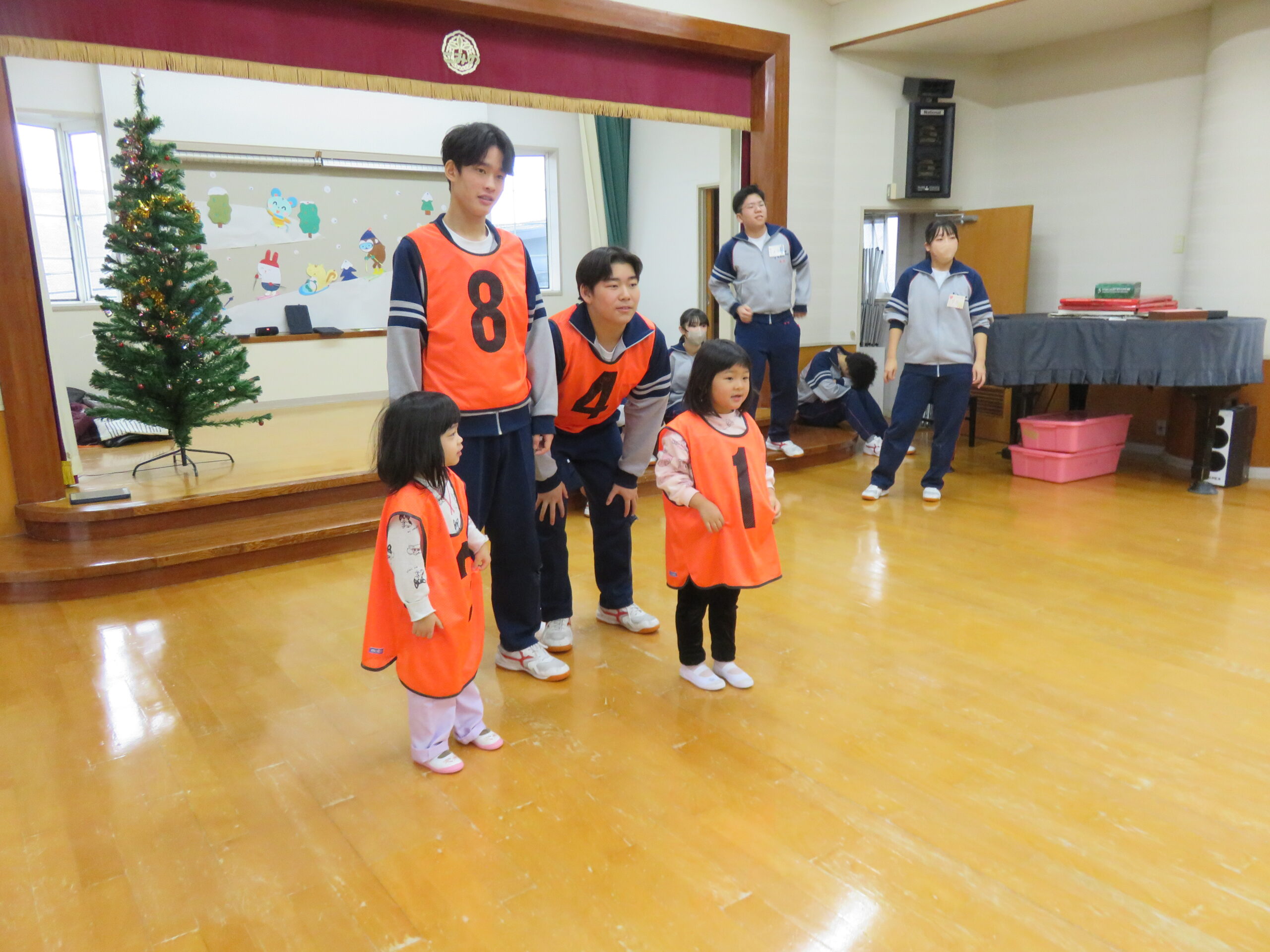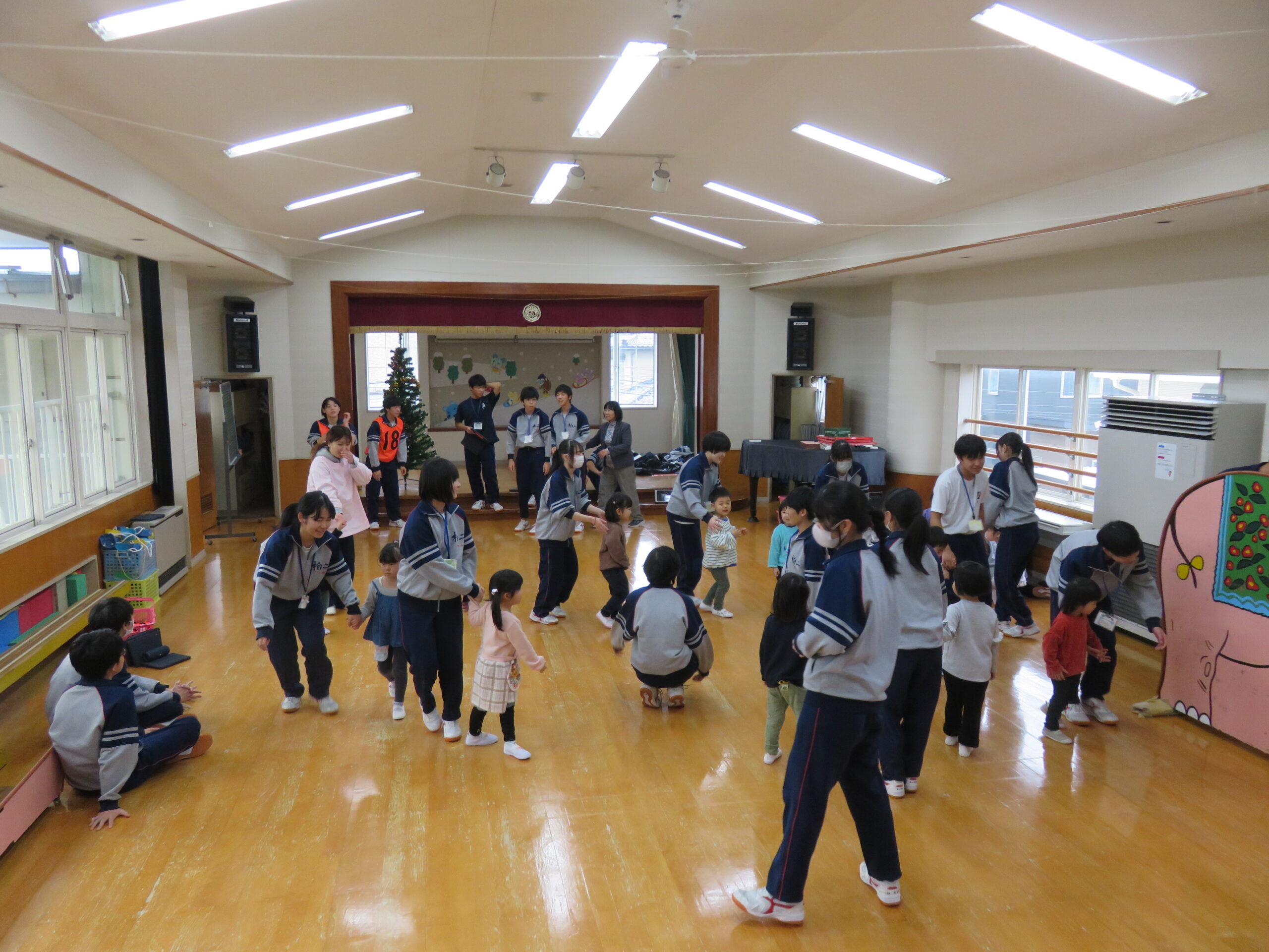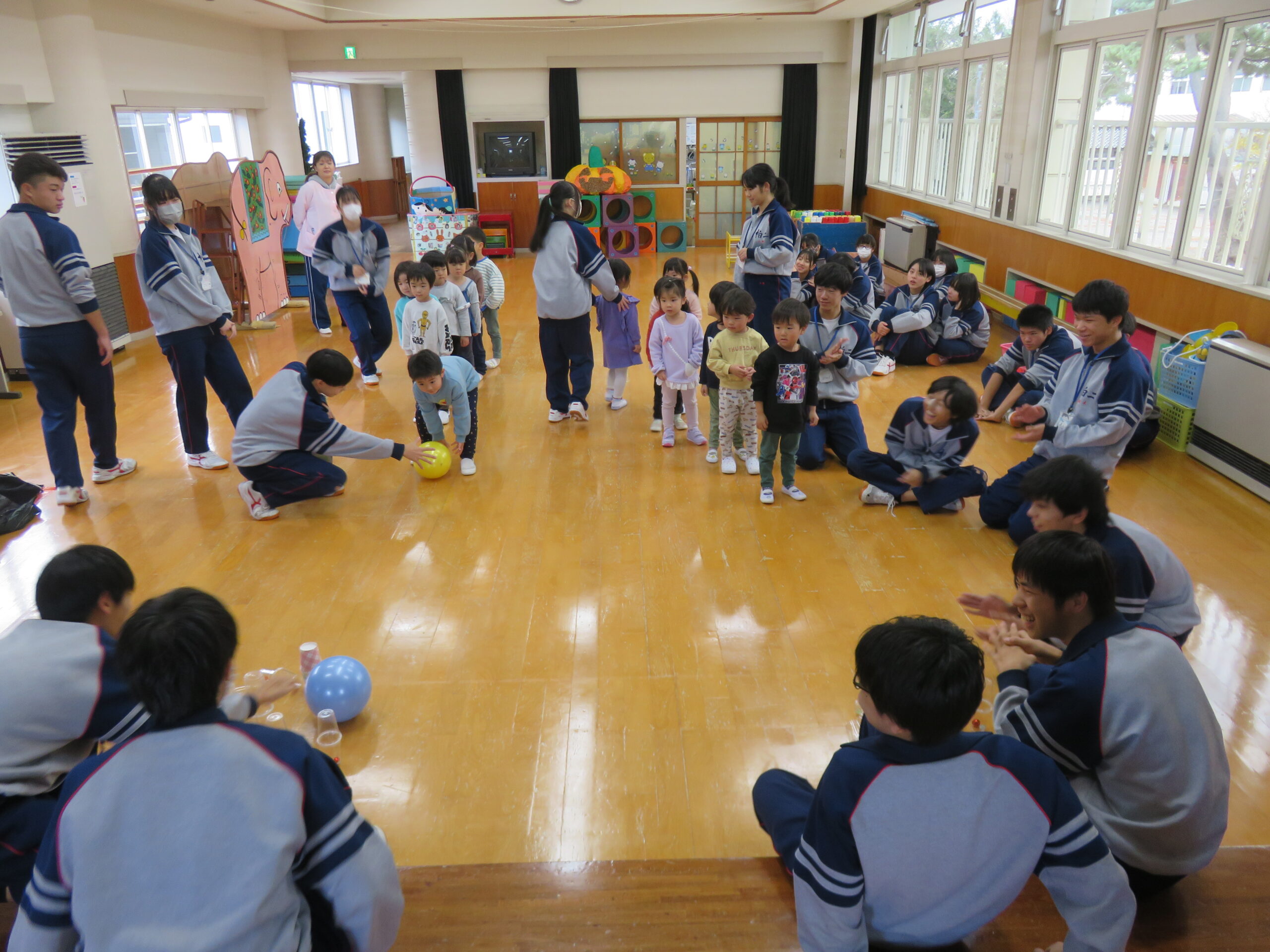 お兄さん、お姉さんたちが考えてきた遊びを一緒に行いました。優しい言葉がけや子どもたちを気づかって手助けしてくれたり等、子どもたちも安心して楽しく参加することができました。
