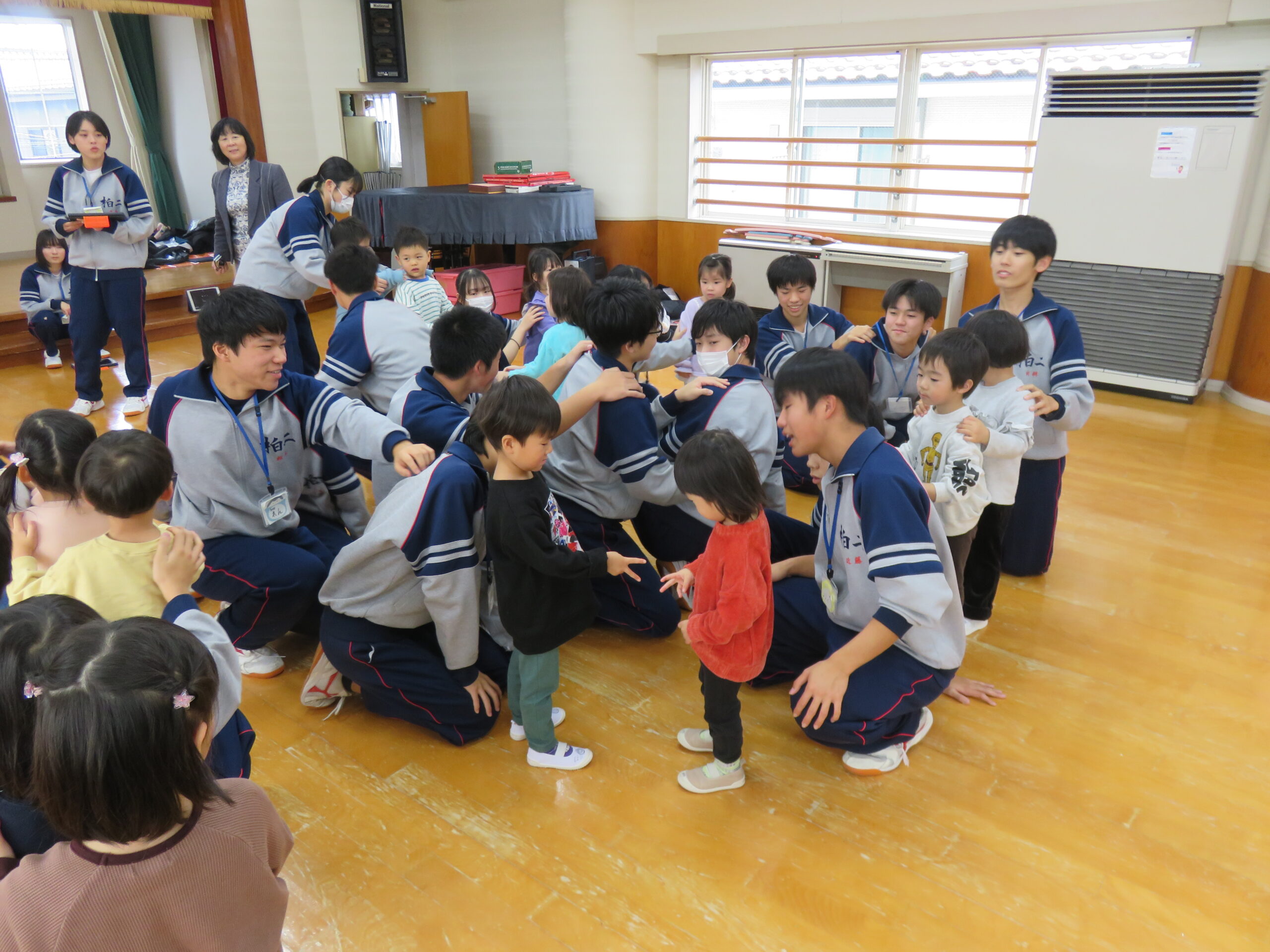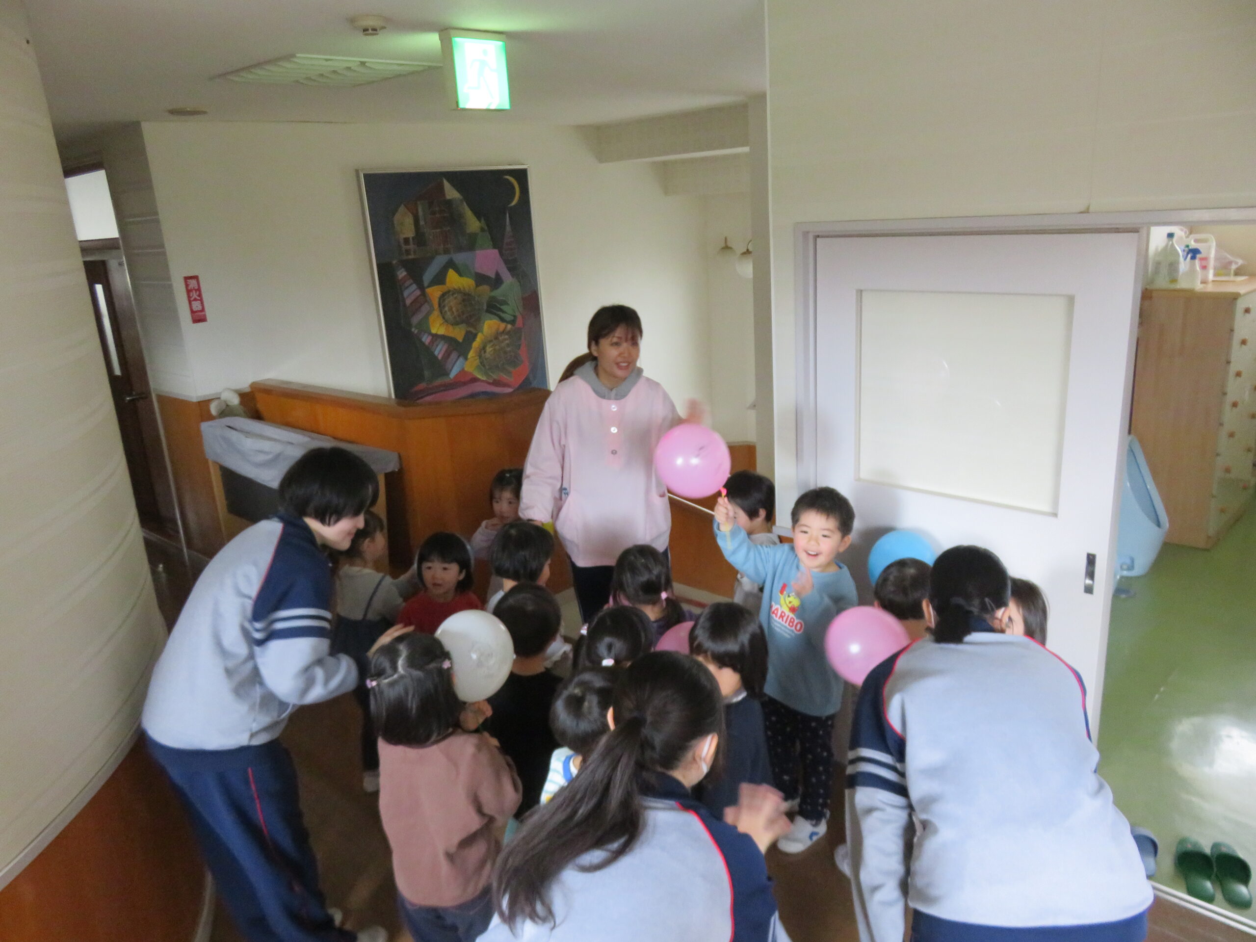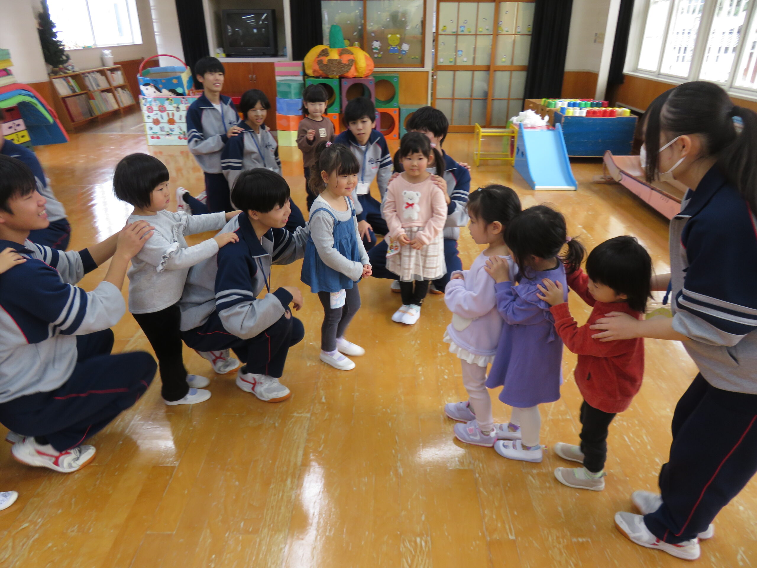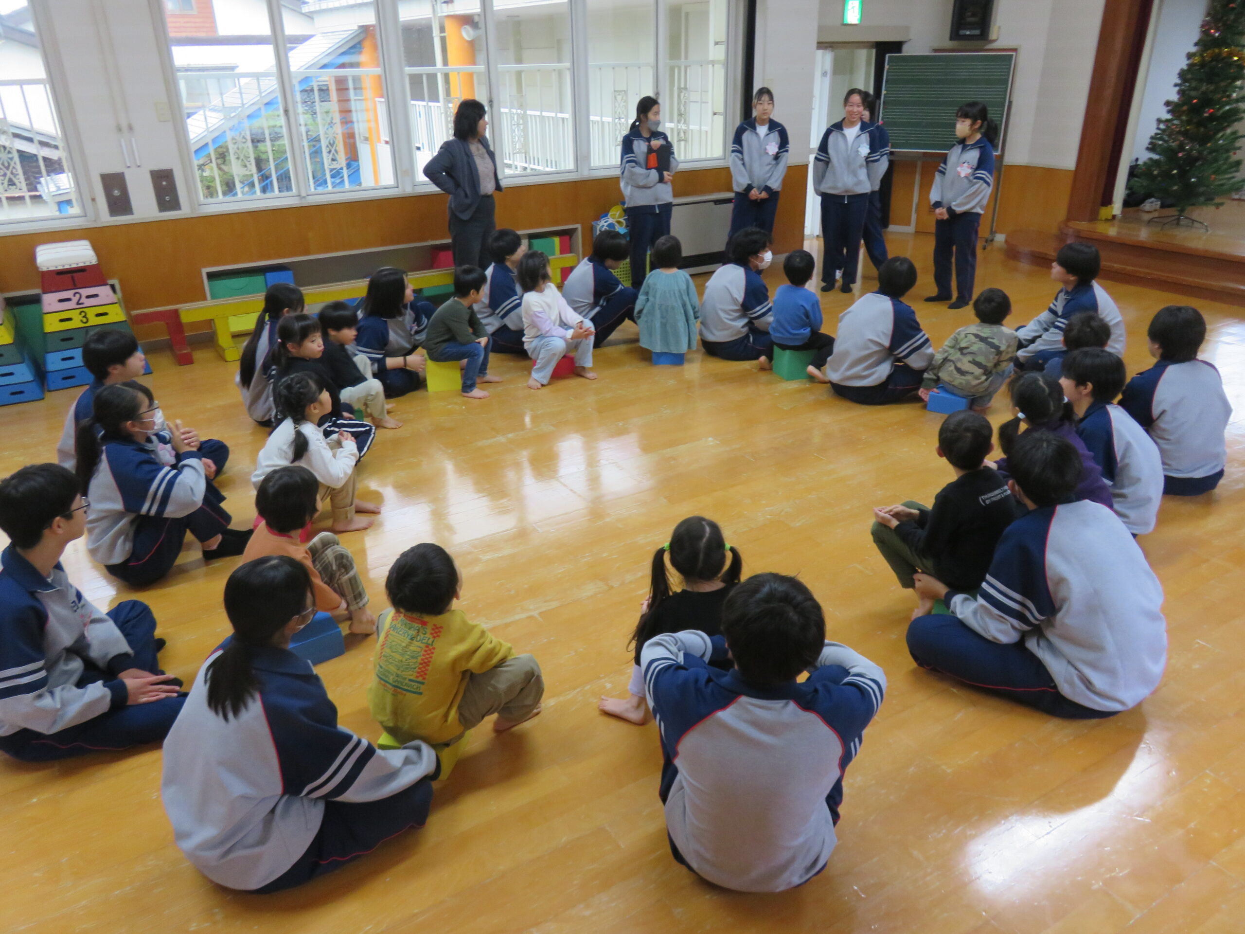 お兄さん、お姉さんたちが考えてきた遊びを一緒に行いました。優しい言葉がけや子どもたちを気づかって手助けしてくれたり等、子どもたちも安心して楽しく参加することができました。
