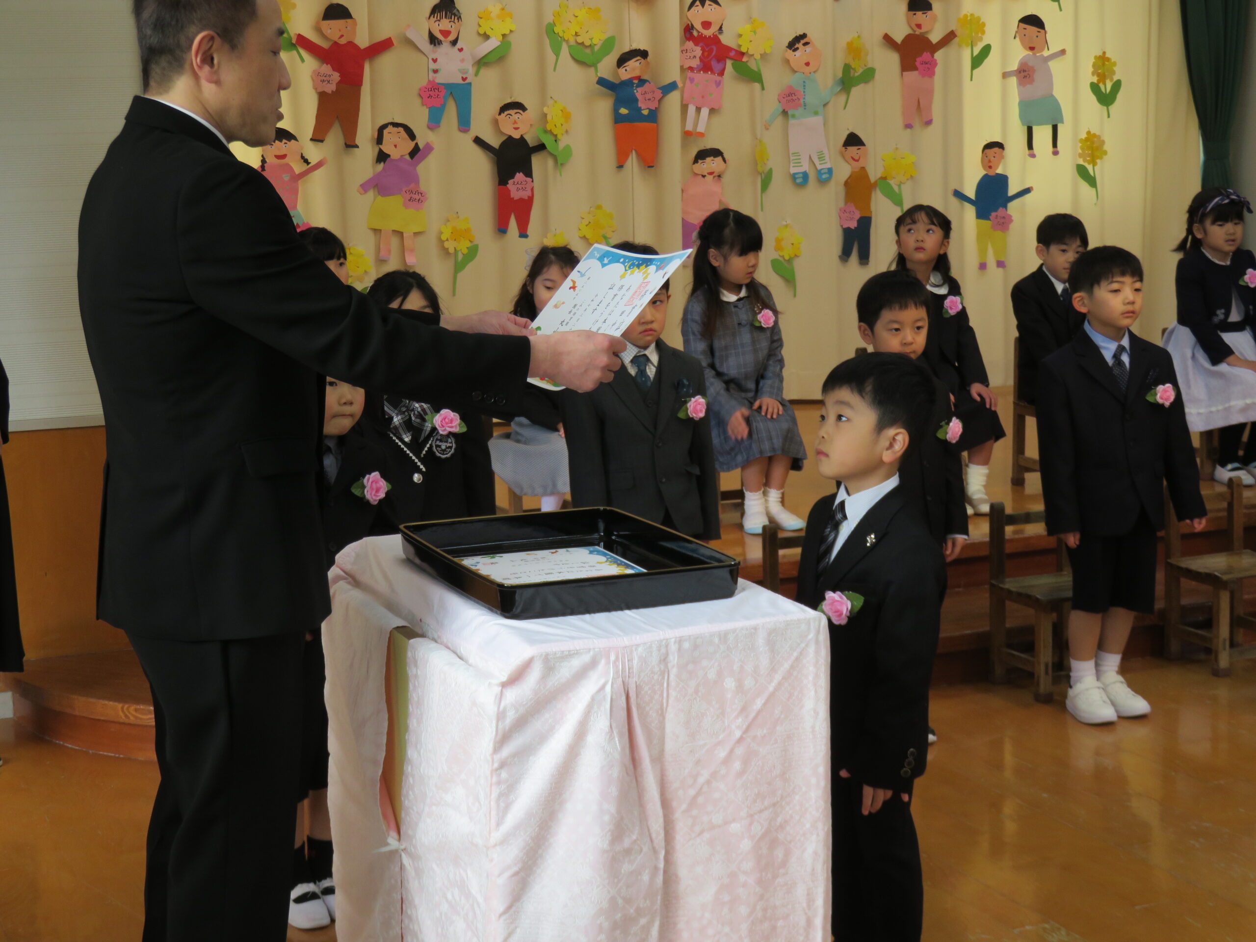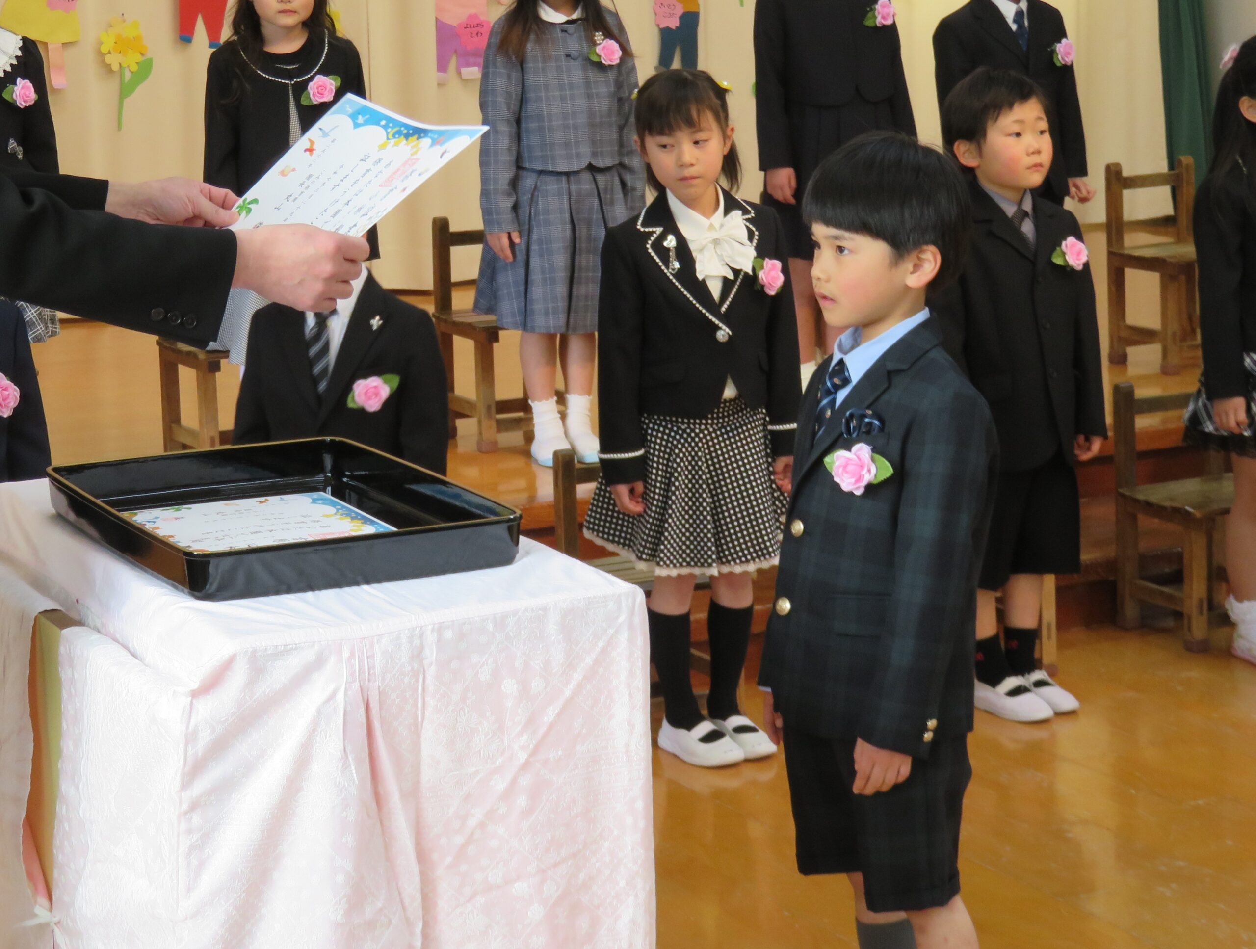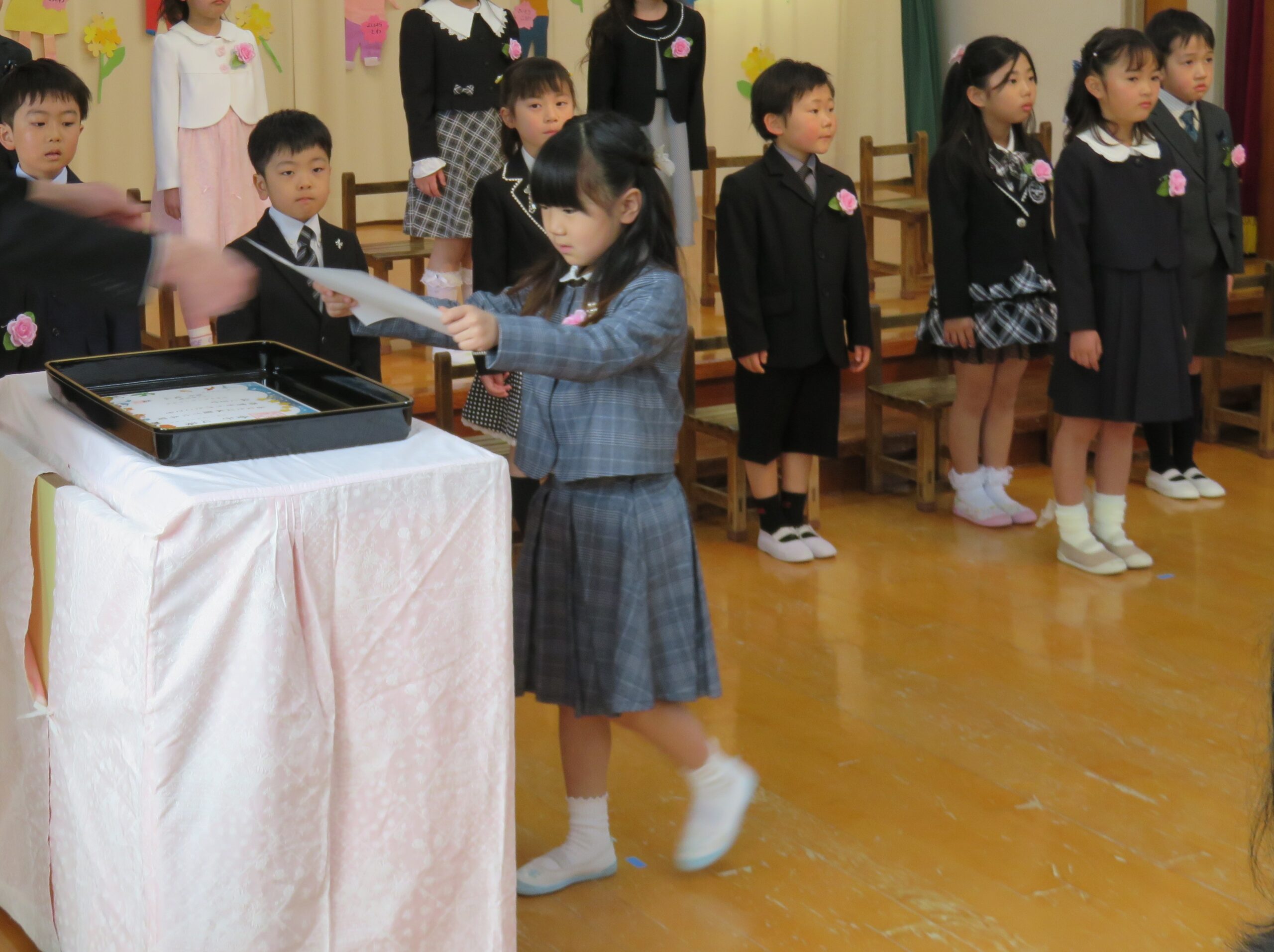 入場、卒園証書授与、歌、お別れ・お家の人への言葉、退場と子どもたちは表情、姿はとてもかっこよかったです!