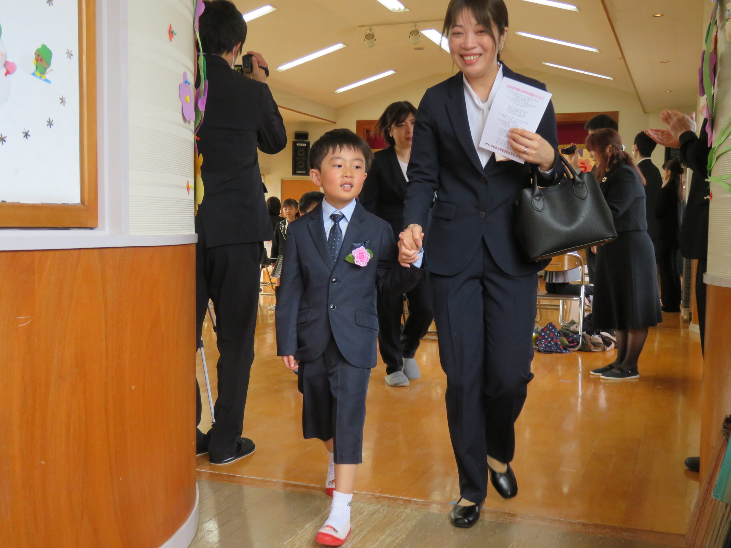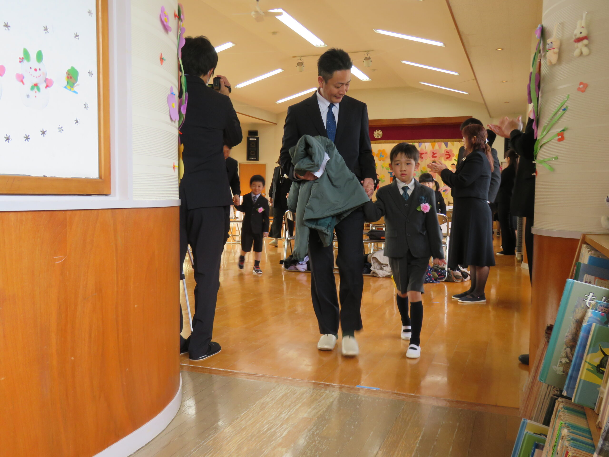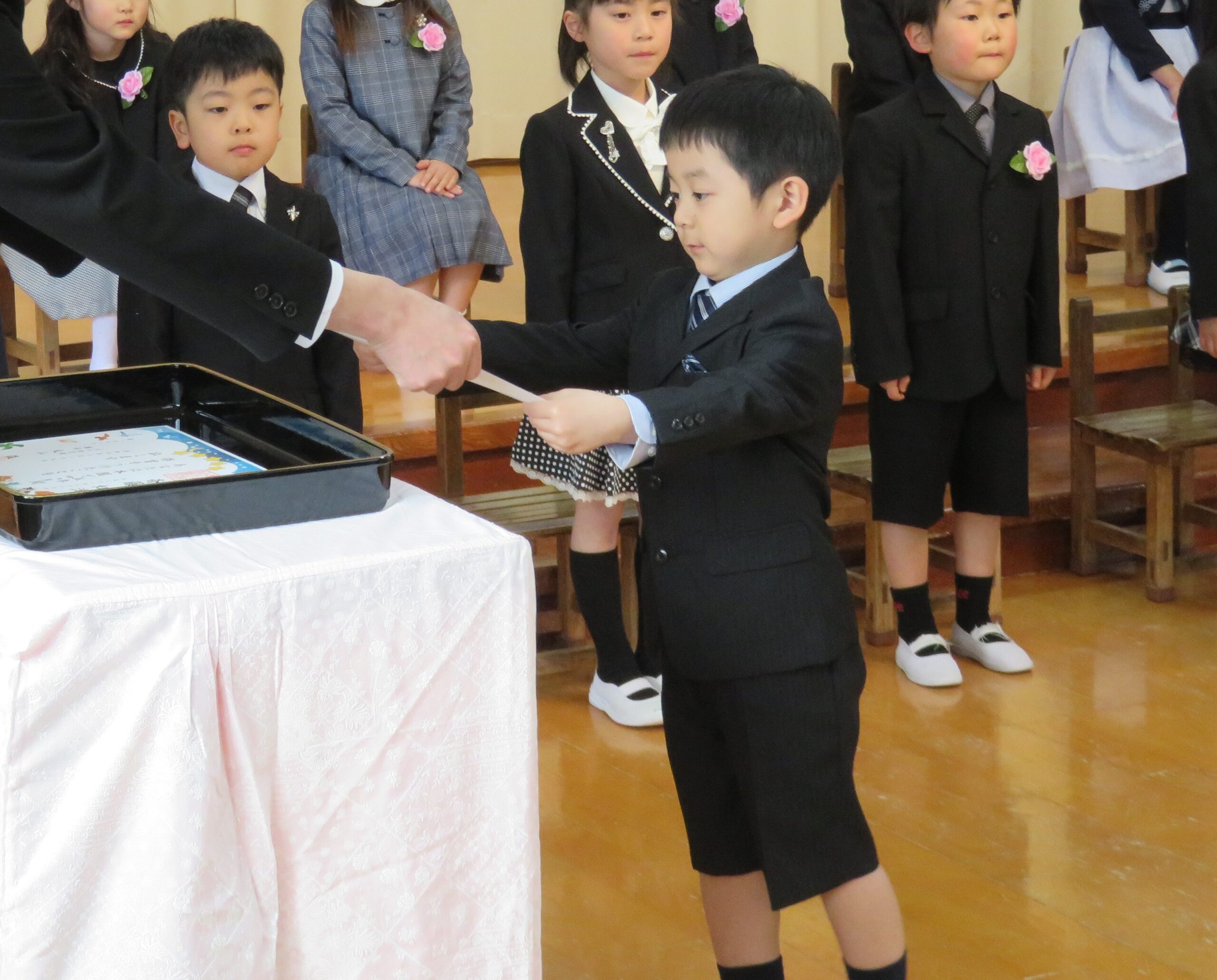 入場、卒園証書授与、歌、お別れ・お家の人への言葉、退場と子どもたちは表情、姿はとてもかっこよかったです!